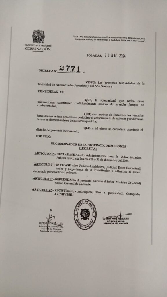El gobernador Hugo Passalacqua, anunció en sus redes sociales la apertura de la Feria Administrativa para la Administración Central, Entes Autárquicos y Organismos Descentralizados de la provincia. La medida, que se implementa cada año, comenzará el jueves 26 de diciembre de 2024 y se extenderá hasta el 7 de febrero de 2025, inclusive.