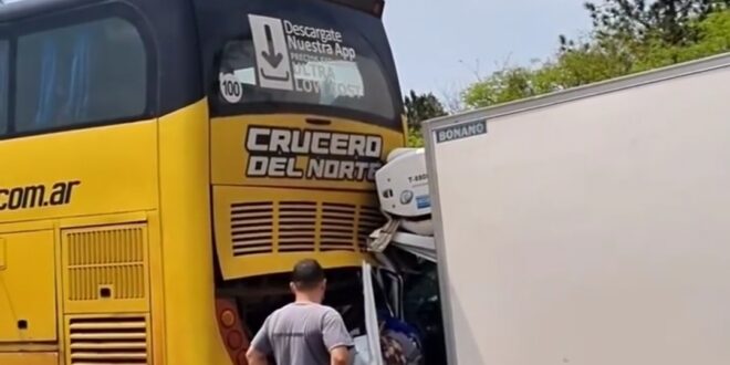 altura de Santa Inés, en Misiones.Siniestro vial sobre Ruta 105, a laUn camión embistió a un colectivo de larga distancia, que viajaba de Paso de Los Libres con destino a Posadas.El conductor del camión resultó lesionado y fue trasladado al Hospital, mientras que los pasajeros del colectivo resultaron ilesos.